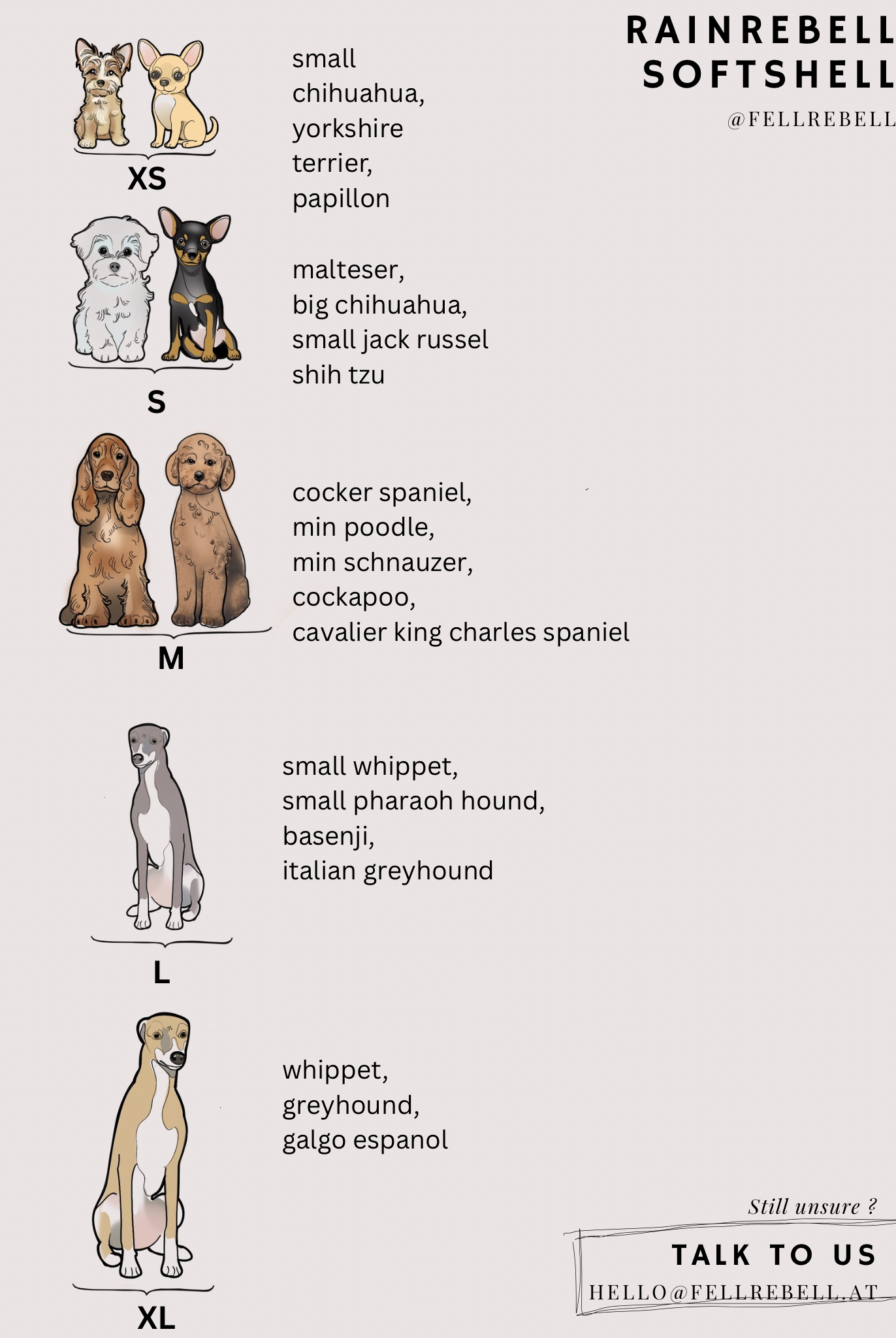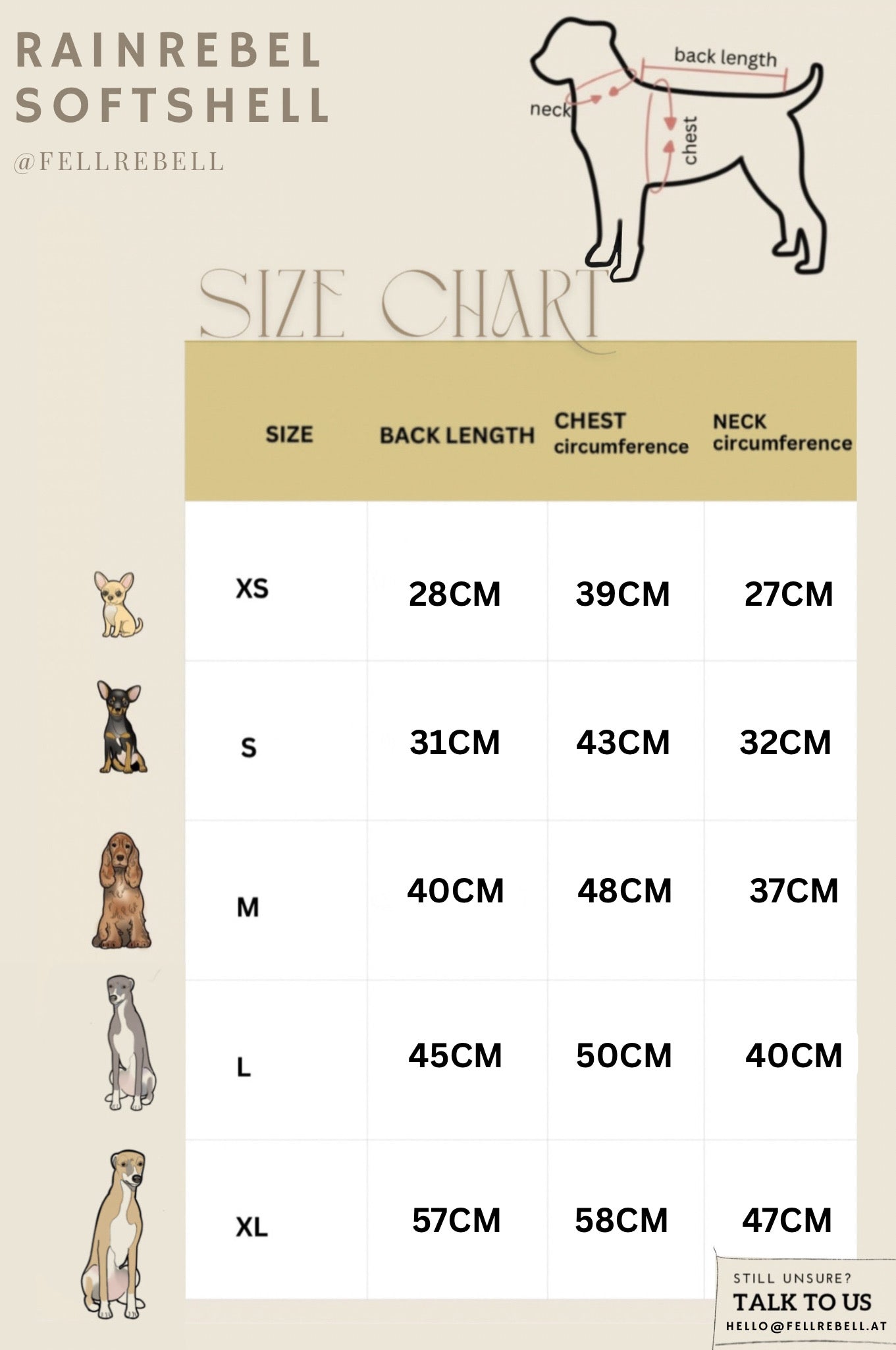 Unsere Produkte gibt es in verschiedenen Passformen – manche eignen sich besser für schlanke Hunde, andere für kräftigere Staturen. So findet jeder Hund sein perfektes Modell. Bitte beachte daher die Größentabelle des jeweiligen Produkts, um die ideale Passform zu wählen.